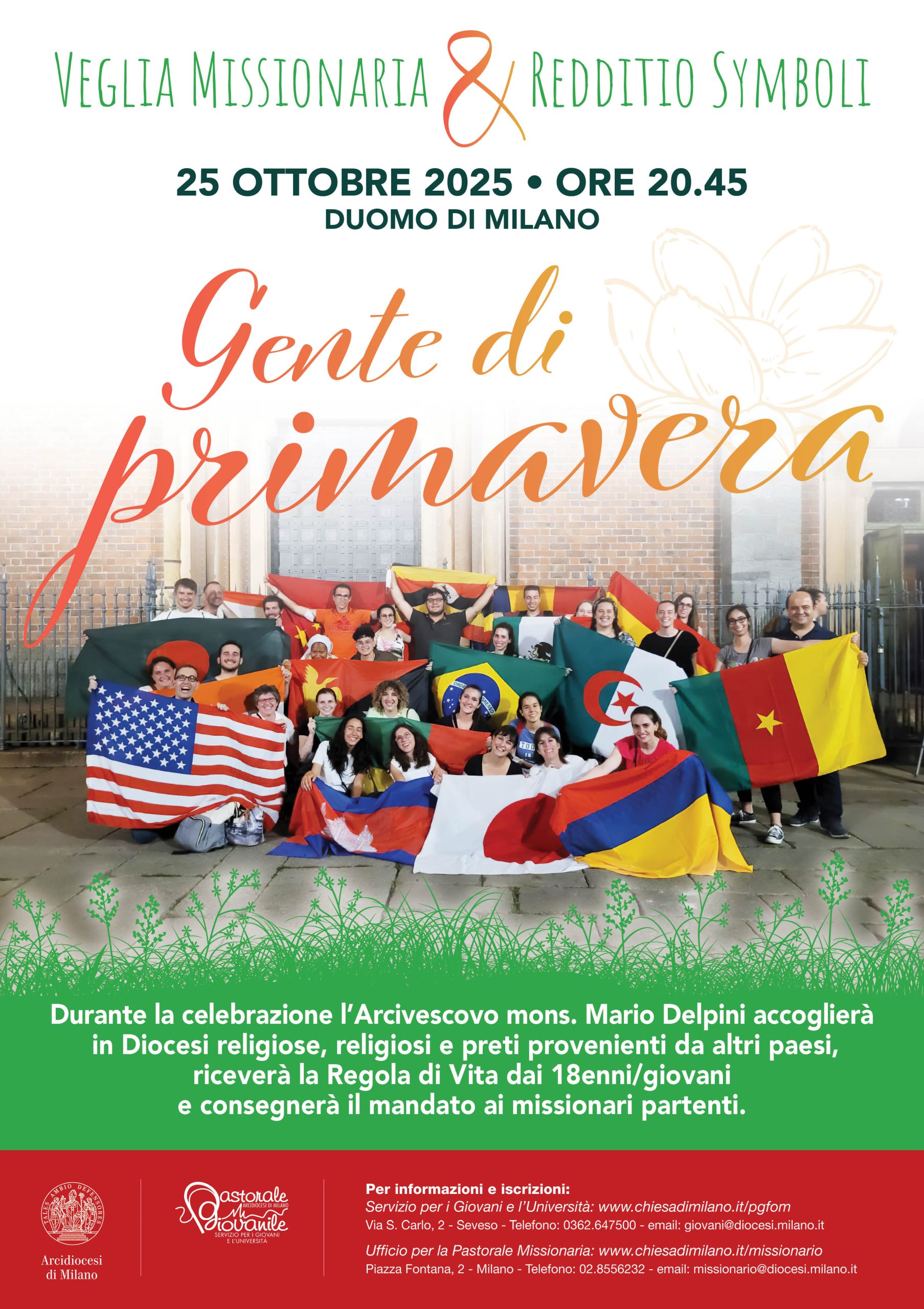 Sabato 25 ottobre, alle 20.45, l’Arcivescovo di Milano, monsignor Mario Delpini, presiederà in Duomo la Veglia missionaria diocesana (diretta sul portale diocesano chiesadimilano.it e sul canale Youtube.com/chiesadimilano). Parteciperanno alla veglia anche i giovani con la Redditio Symboli Un’unica celebrazione per intrecciare tre gesti significativi: la consegna del crocifisso ai missionari in partenza, l’accoglienza dei nuovi arrivati e la promessa dei giovani, chiamati a consegnare la propria Regola di vita. Tre volti di una stessa Chiesa “di primavera”, che fiorisce nella speranza e nella testimonianza del Vangelo. Testo Testo2 Locandina